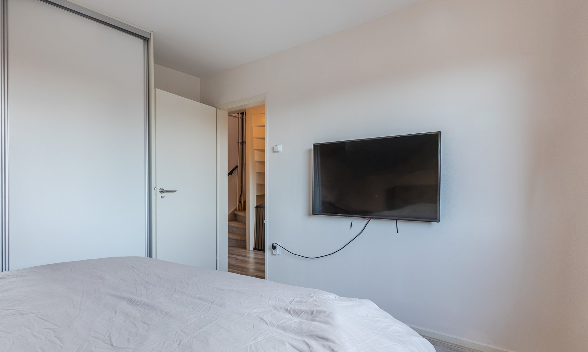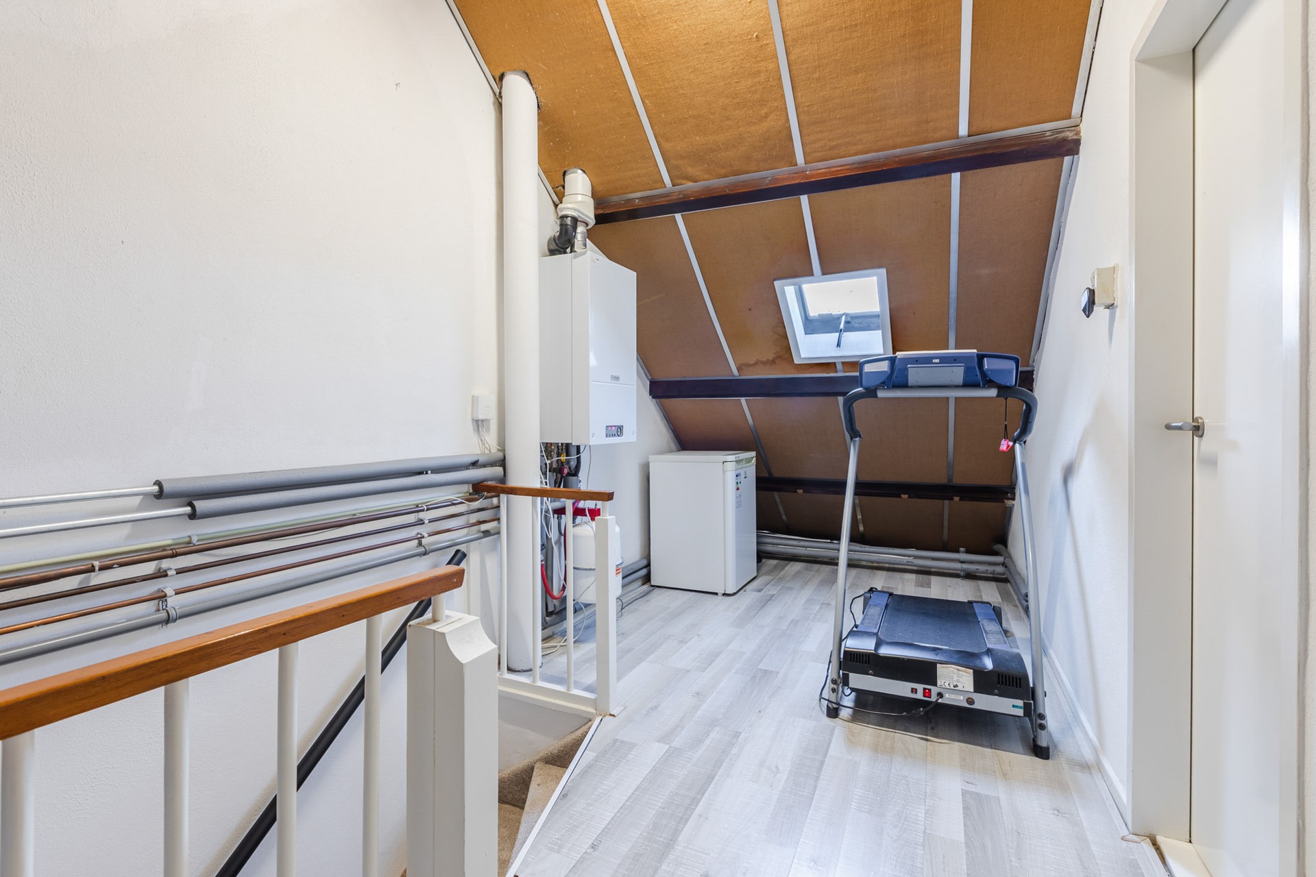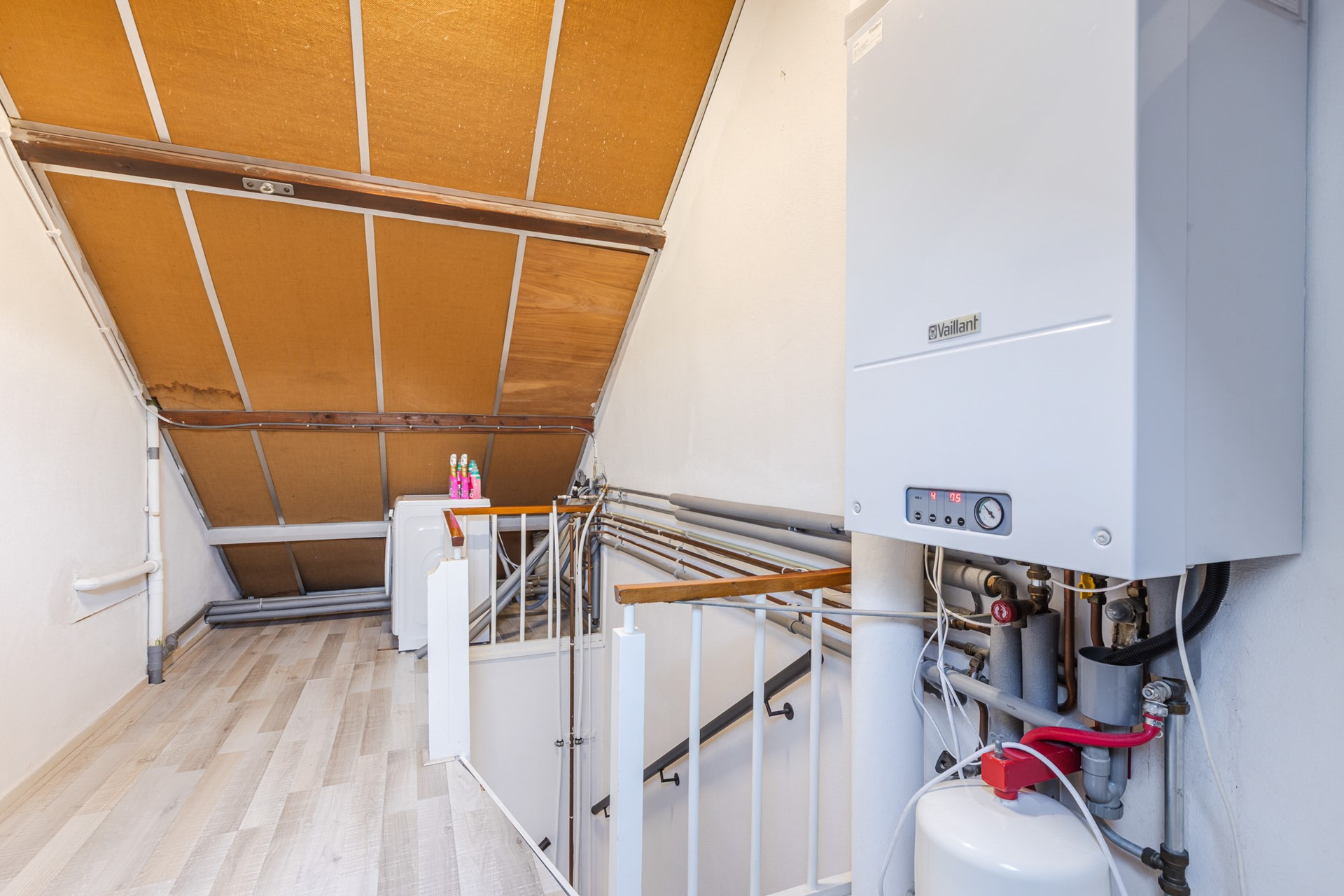 Via een vaste trap bereik je de tweede verdieping. Op de voorzolder zijn de Vaillant cv-installatie en de wasmachineaansluiting netjes opgesteld. Daarnaast is hier een ruime vierde slaapkamer gerealiseerd. Deze kamer leent zich uitstekend als master slaapkamer, logeer- of werkkamer en biedt bovendien extra bergruimte (inbouwkast) onder de schuine kanten.