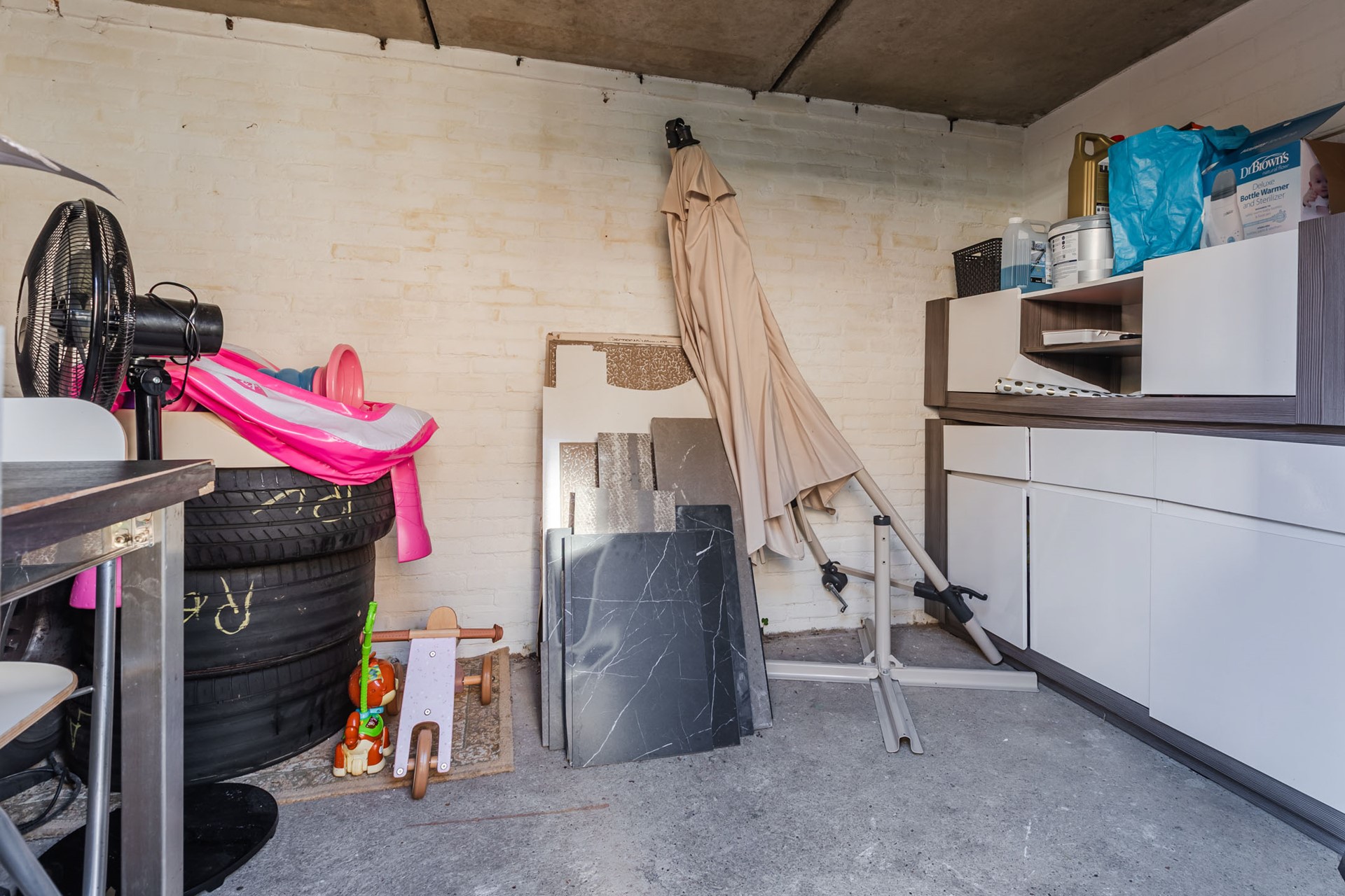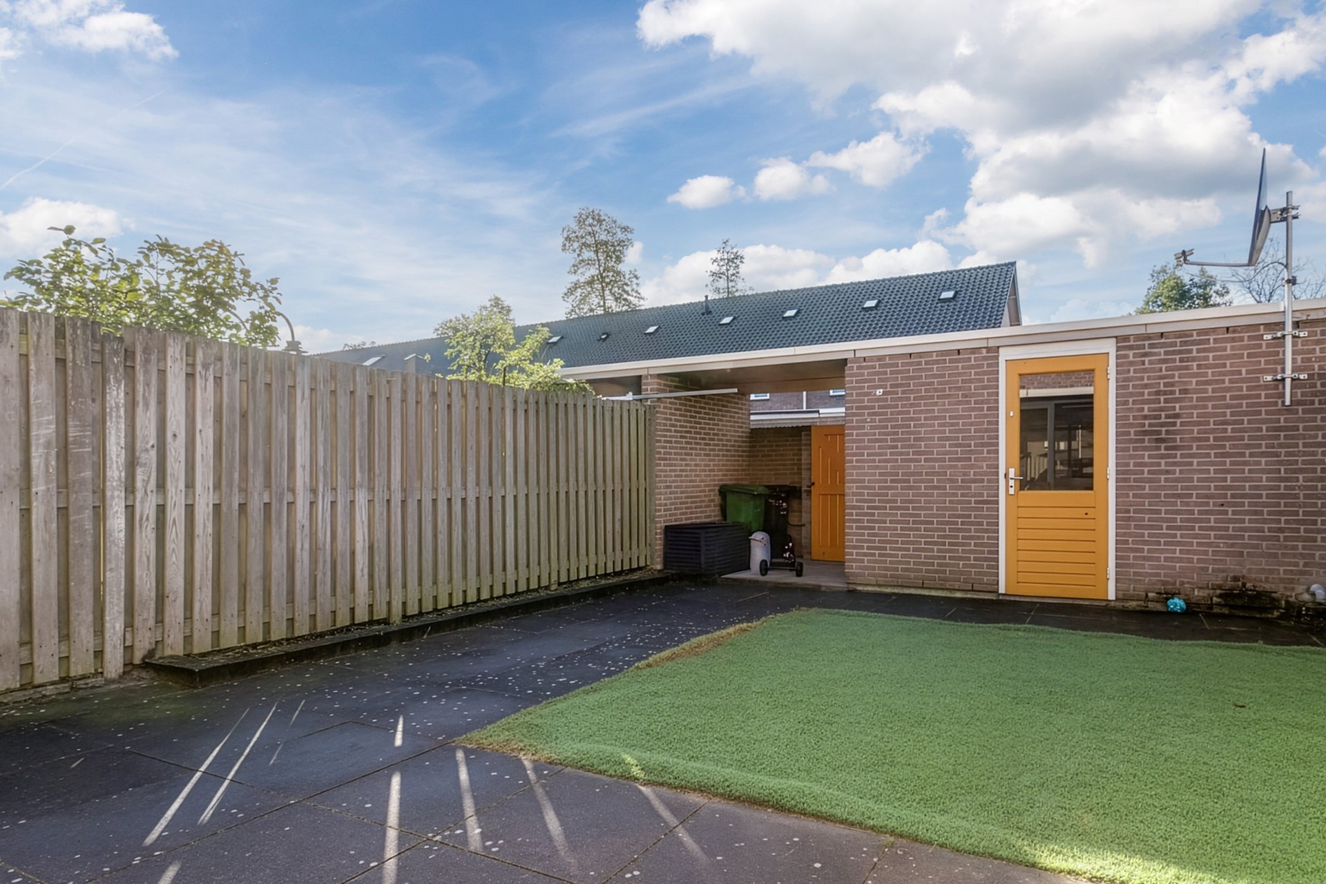 De achtertuin is ruim en bestraat gedeeltelijk met kunstgras. Er zijn enkele borders voor groen, en achter in de tuin staat een stenen berging met elektra – ideaal voor fietsen en opslag – met daarnaast een handige overkapping. Via de achterom ben je zo in de brandgang. Aan de voorzijde is voldoende parkeergelegenheid op openbaar terrein.