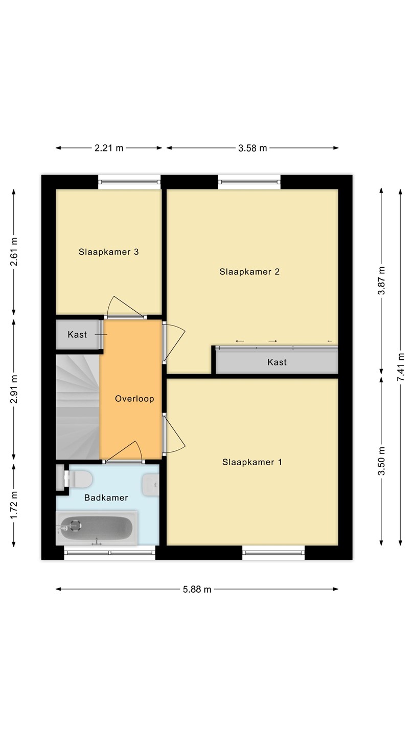 Op de eerste verdieping bevinden zich drie goed bemeten slaapkamers, allemaal voorzien van een nette vloer en rustige kleuren. Twee kamers zijn ideaal als hoofdslaapkamer en ruime kinderkamer; de derde kamer is perfect als babykamer, werkplek of walk-in closet. Er zijn bovendien praktische inbouwkasten aanwezig.