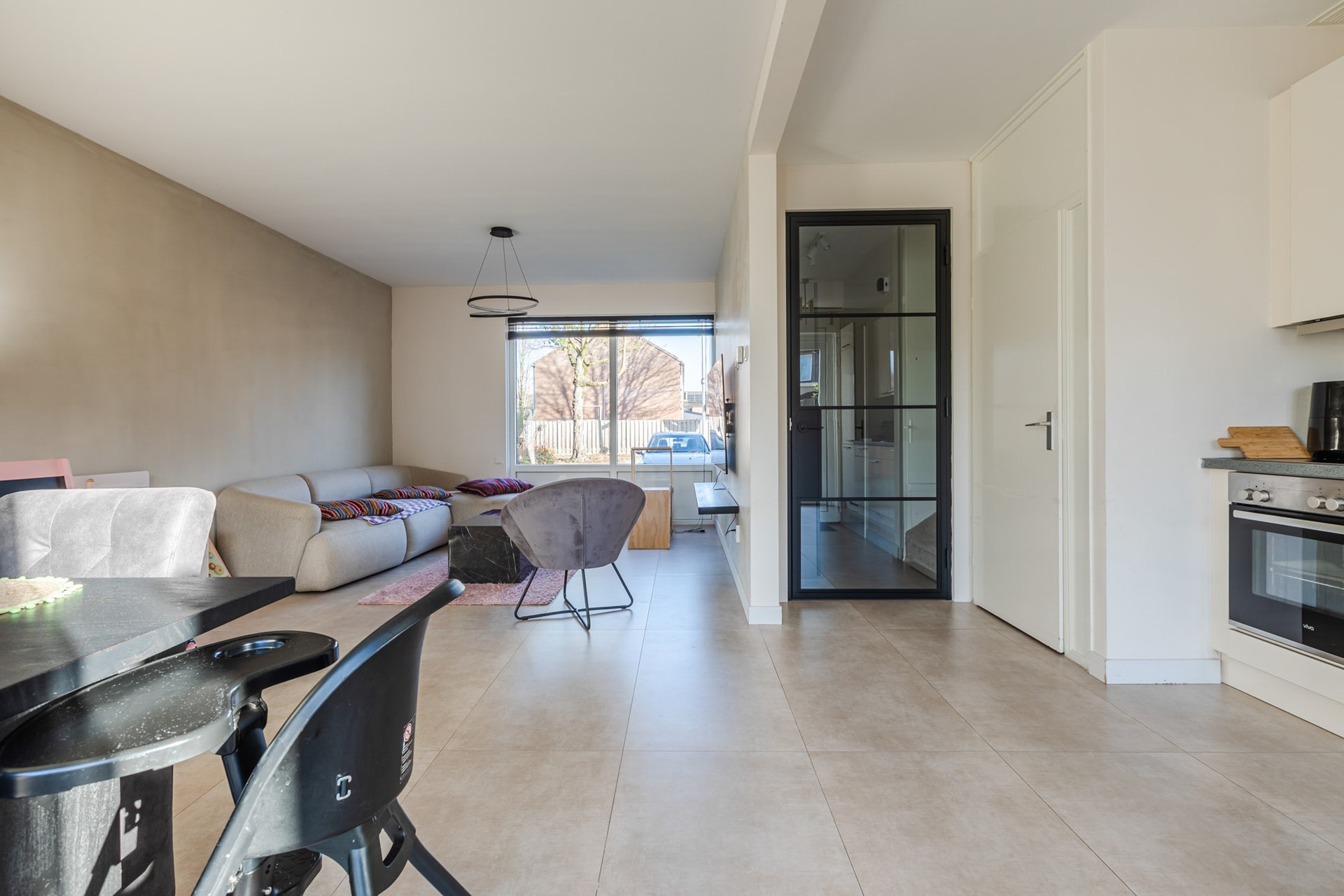 Daarna stap je de lichte woonkamer in. De grote ramen aan de voorzijde zorgen voor veel daglicht. De vloer is afgewerkt met grote, neutrale vloertegels die doorlopen richting keuken: praktisch, strak en onderhoudsvriendelijk. De wanden zijn glad gestuukt in rustige tinten, waardoor elke woonstijl hier goed tot zijn recht komt. Je hoeft alleen nog je eigen meubels neer te zetten.