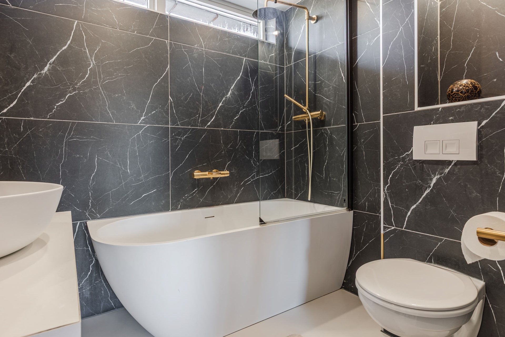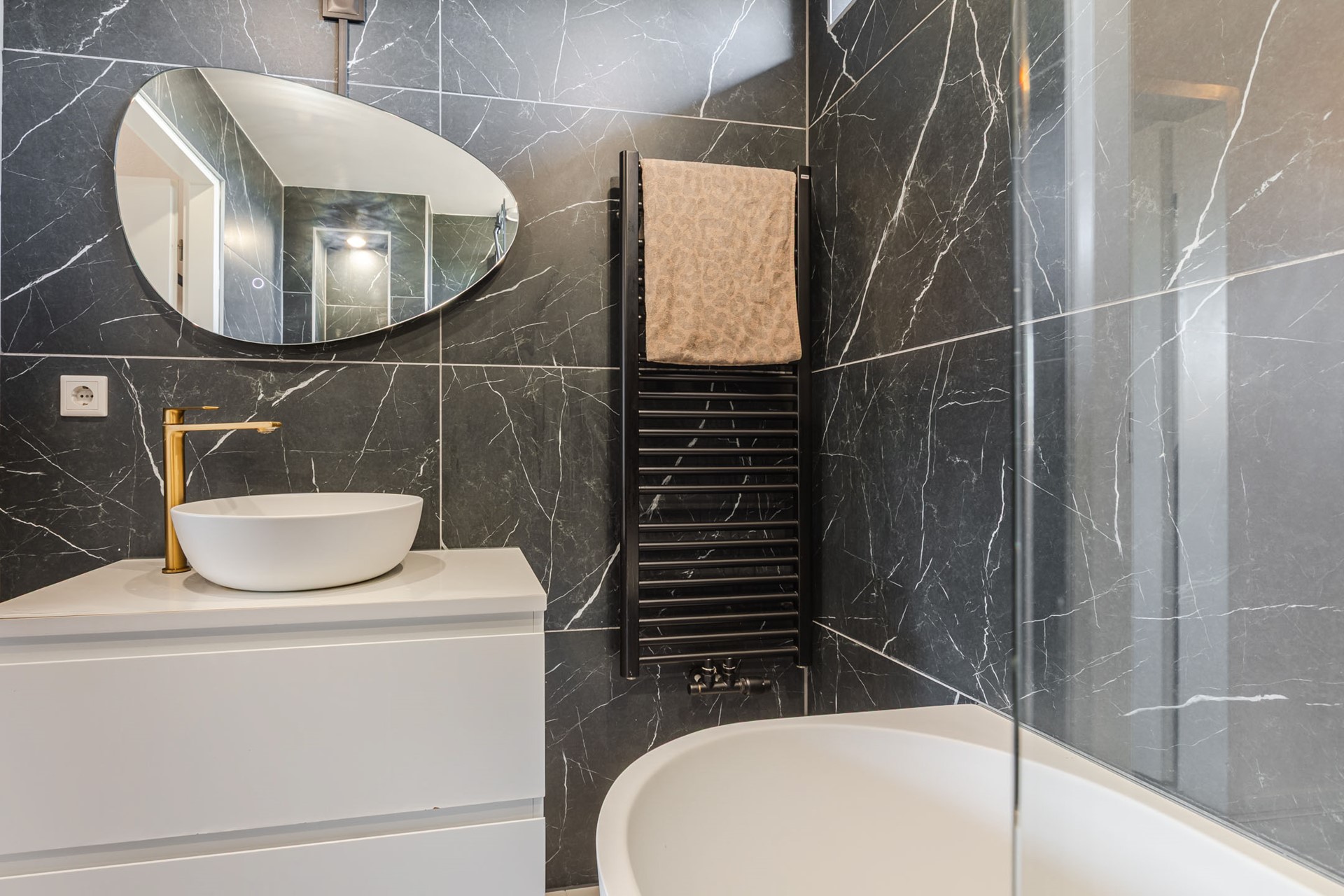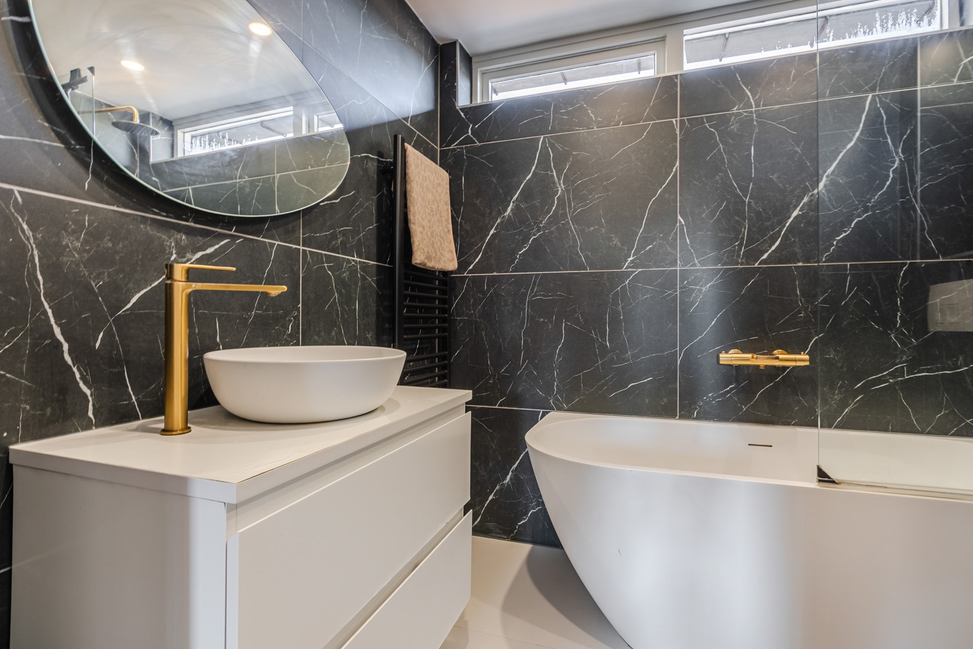 De badkamer is een echte blikvanger: uitgevoerd in donkere marmerlook tegels met goudkleurige kranen en details. Hier vind je een modern wastafelmeubel, een vrijdragend toilet en een comfortabel ligbad met douchefunctie. Een luxe ruimte waar je helemaal tot rust komt.
