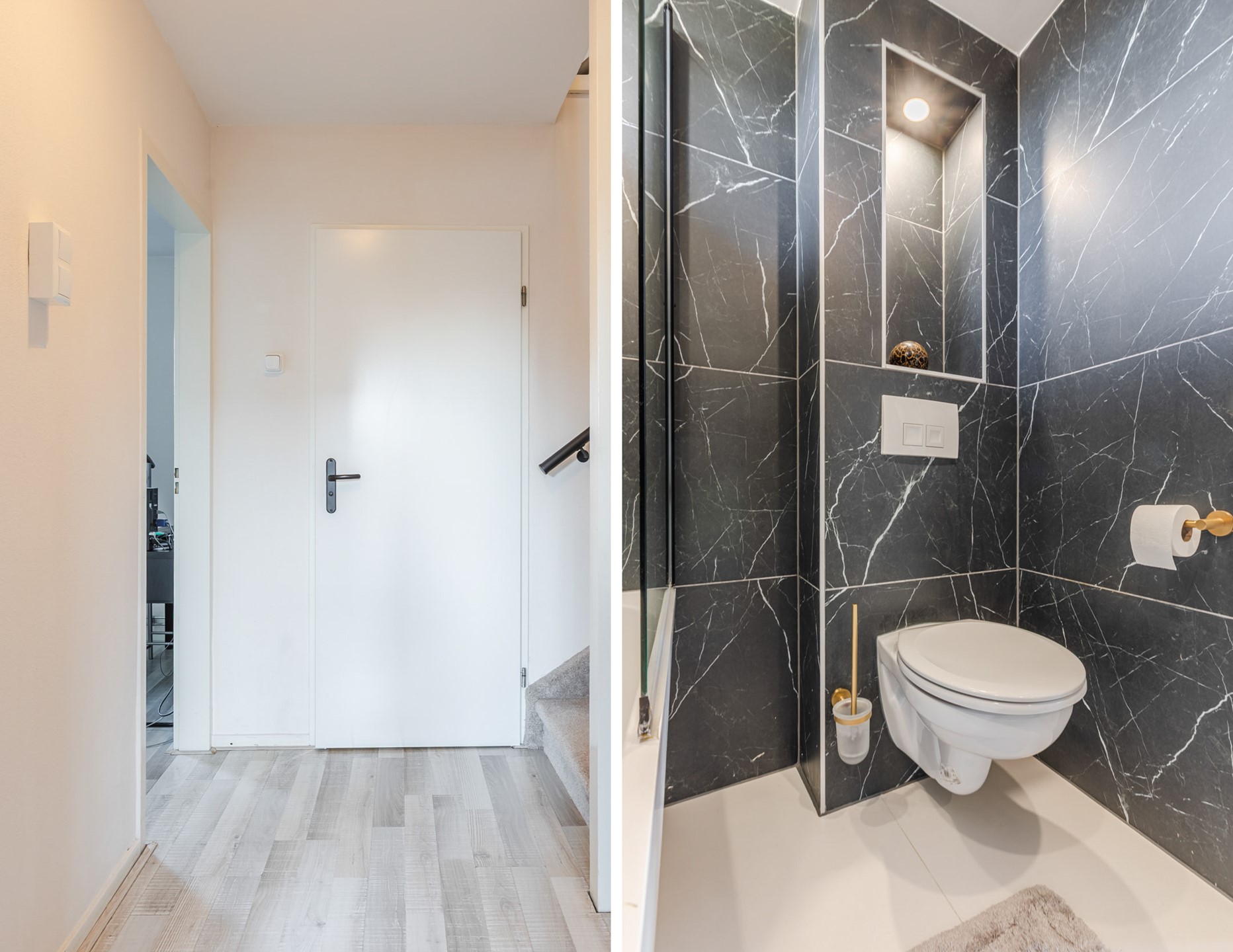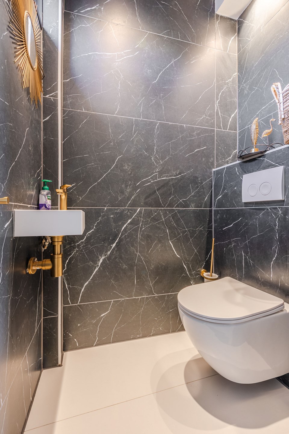 Via de nette voortuin kom je binnen in de hal met garderobe, meterkast, trapkast en het moderne toilet met fonteintje. Deze toiletruimte is fraai afgewerkt in donkere marmerlook tegels met stijlvol goudkleurig sanitair – echt een visitekaartje van de woning.