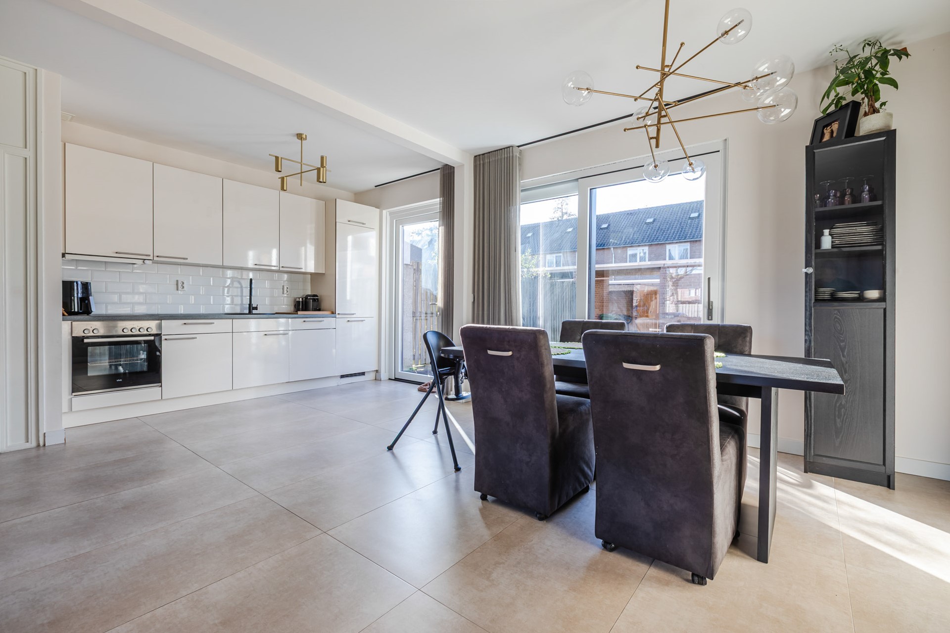Aan de tuinzijde ligt de moderne, witte keuken in rechte opstelling. De keuken is voorzien van diverse inbouwapparatuur, zoals een kookplaat, oven en afzuigkap. De glanzende kasten en het frisse witte tegelwerk geven de keuken een tijdloze uitstraling. Via de tuindeur loop je zo de achtertuin in.