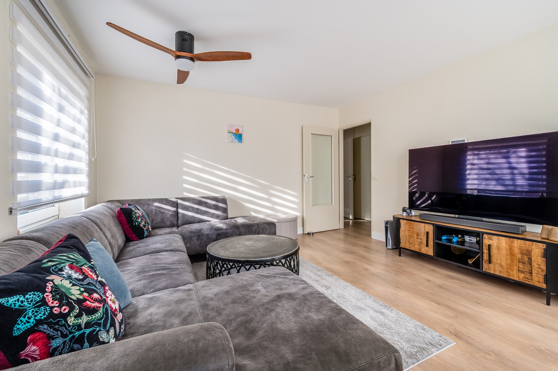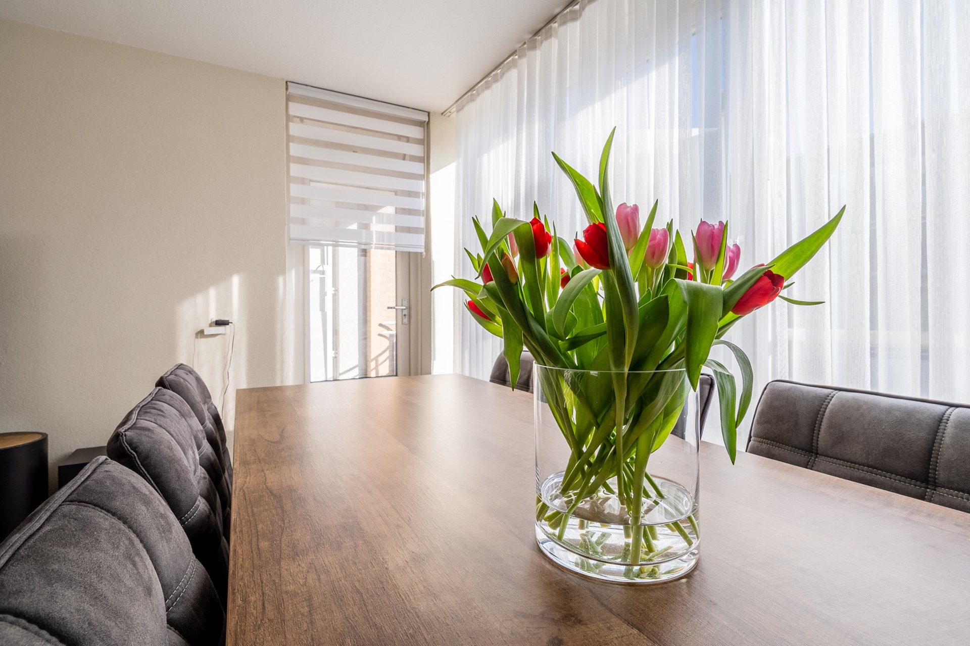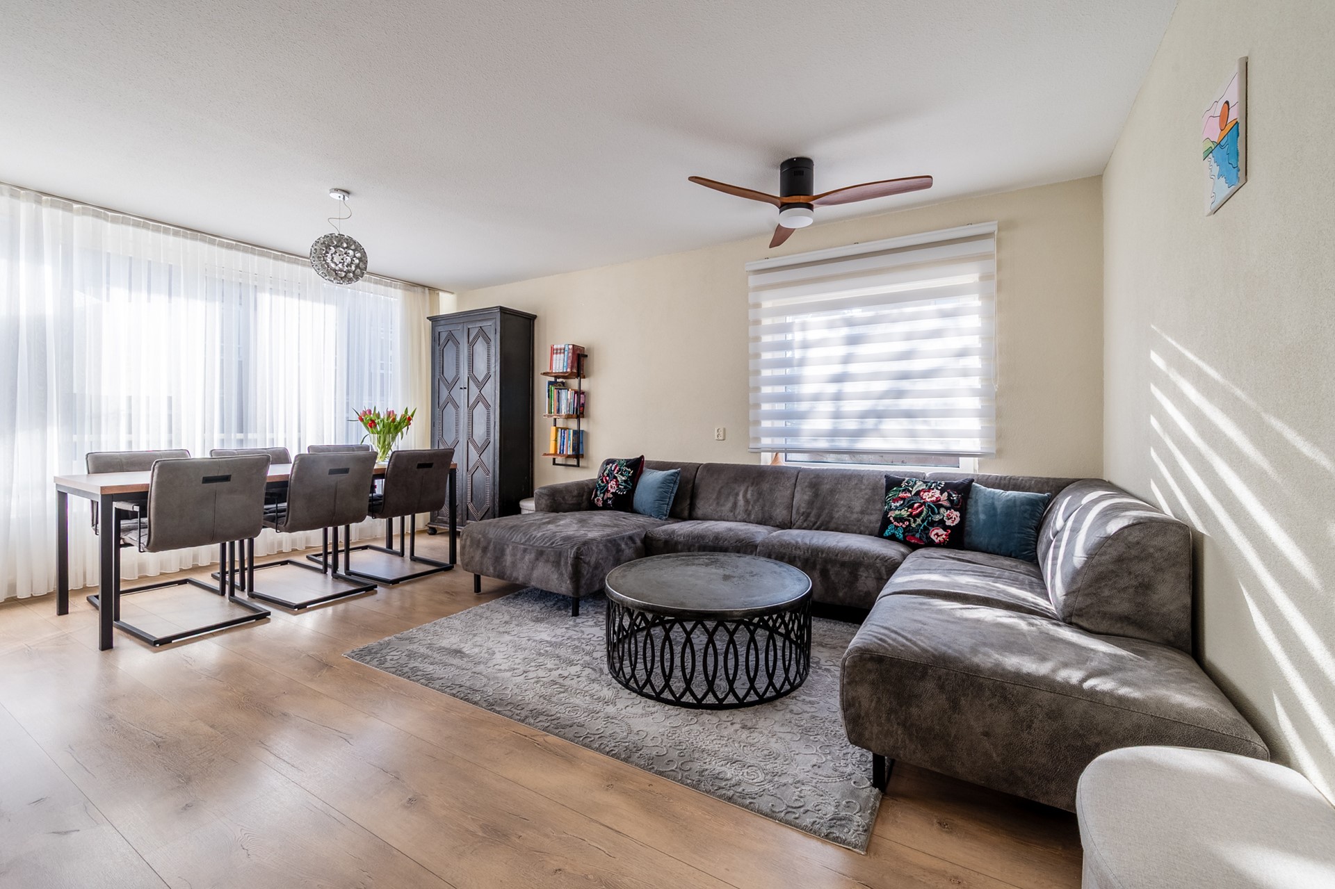 De lichte woonkamer is royaal van opzet en biedt voldoende ruimte voor een comfortabele zithoek en een aparte eethoek met toegang tot het balkon. Aangrenzend bevindt zich de dichte keuken, voorzien van diverse apparatuur en met directe toegang tot het **balkon**. Een fijne plek voor een kop koffie in de ochtend of een moment rust aan het einde van de dag.