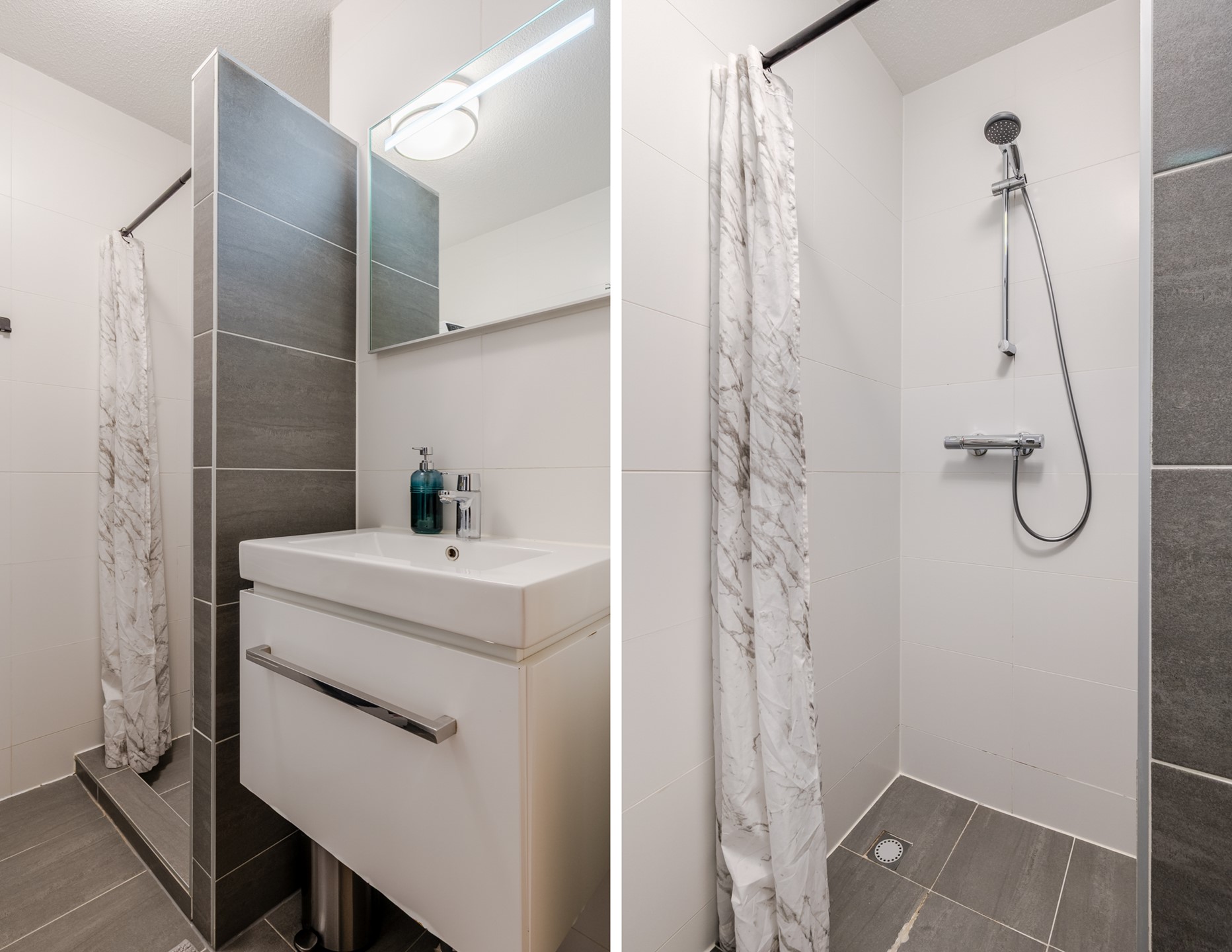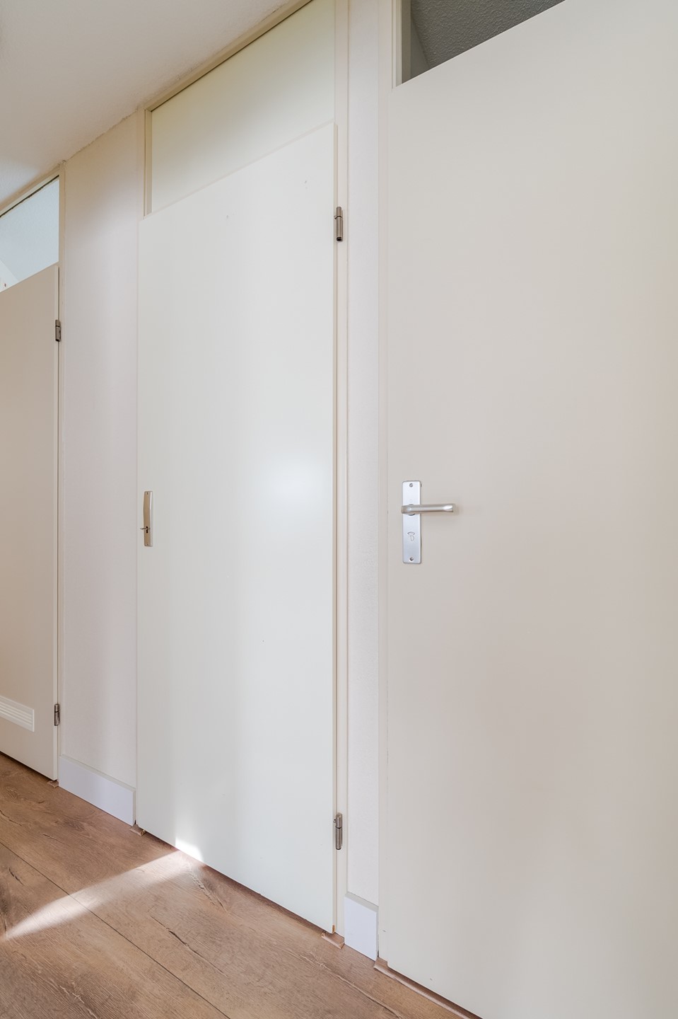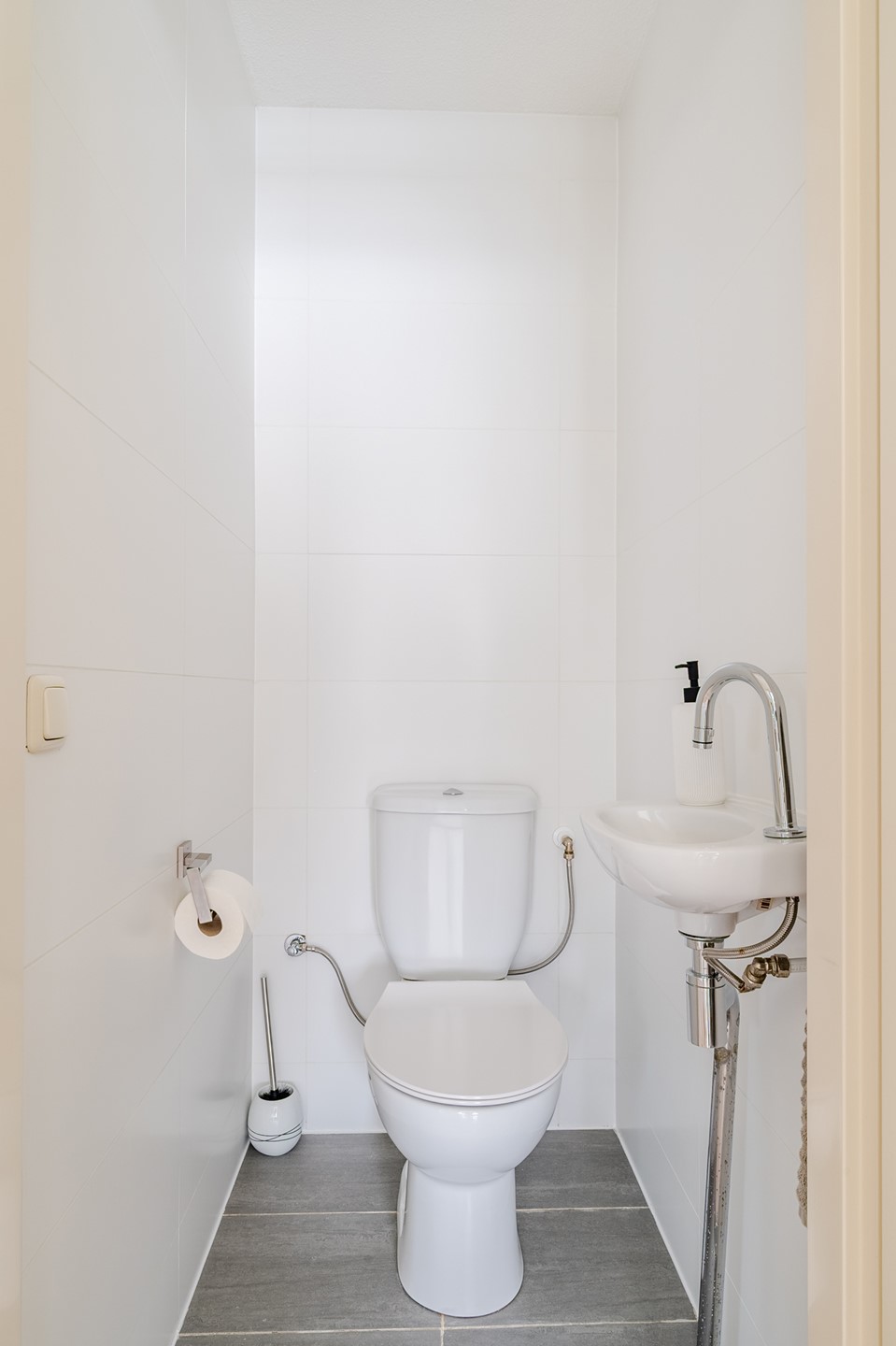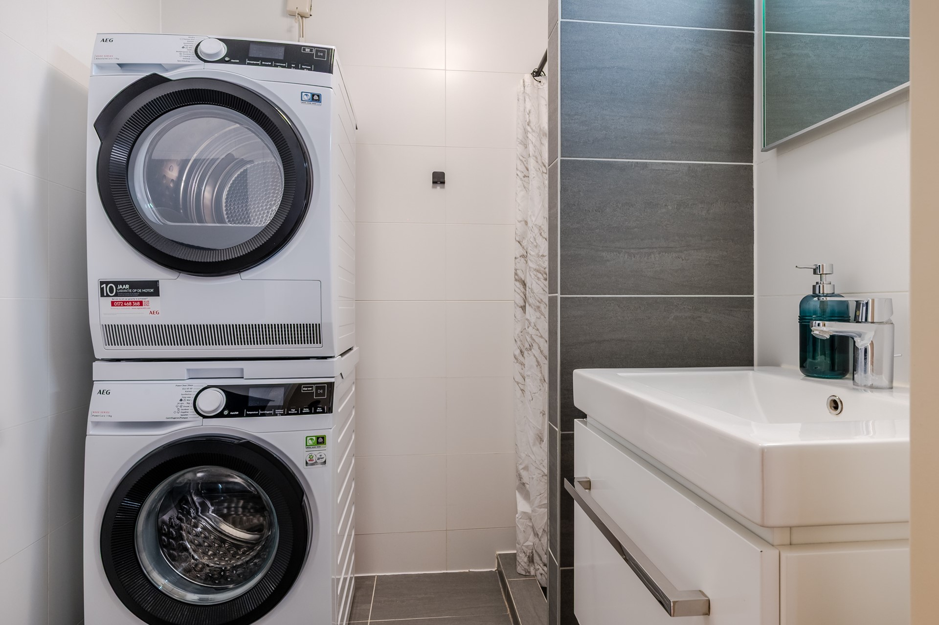 De badkamer is modern uitgevoerd en beschikt over een douche, wastafelmeubel en aansluiting voor wasmachine en droger. Daarnaast is er een separate toiletruimte met fonteintje. In de hal bevindt zich tevens een praktische inpandige kast.